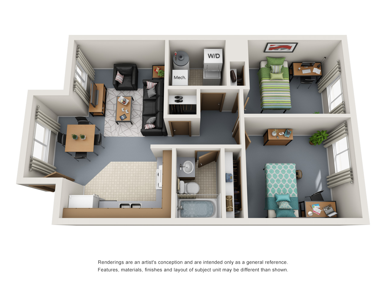 Single students have a choice of dorm living or sharing an apartment.